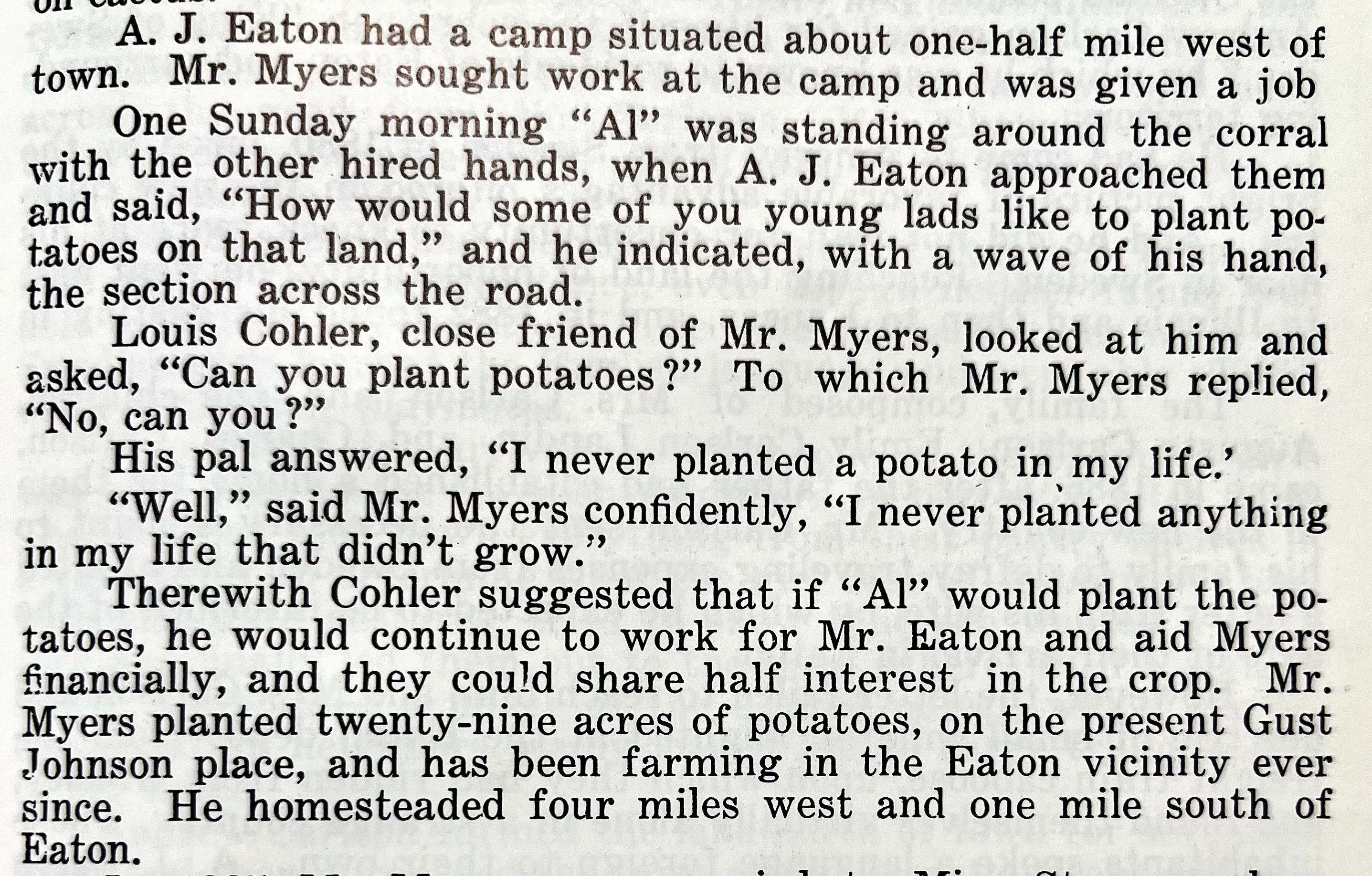 Al Myers went on to help found and operate a very successful Potato Coop in Eaton From The History of Eaton, Colorado by Pauline Smilie The book is available at the Museum